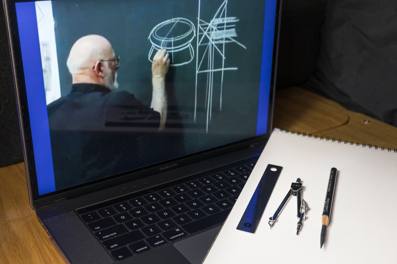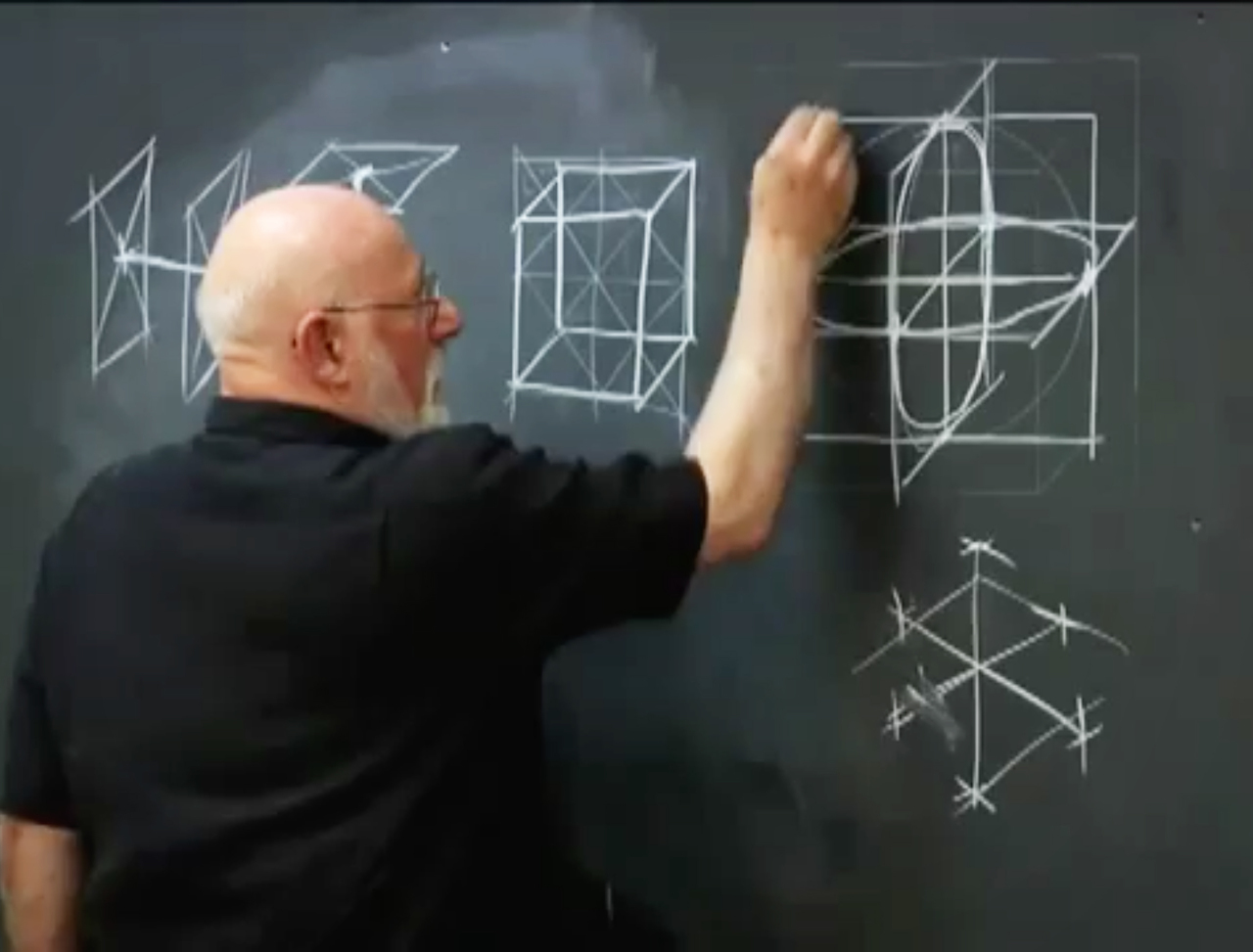 Conceive and describe the surface contours and cross-contours of a sphere; construct the circle template and divisions within the sphere; tessellation, cross-sections, and dimensional truncations; invent complex interior 3D geometries.