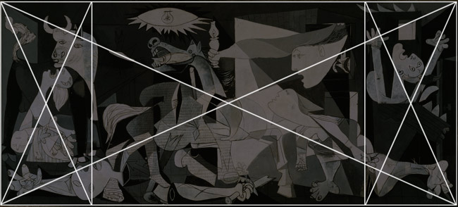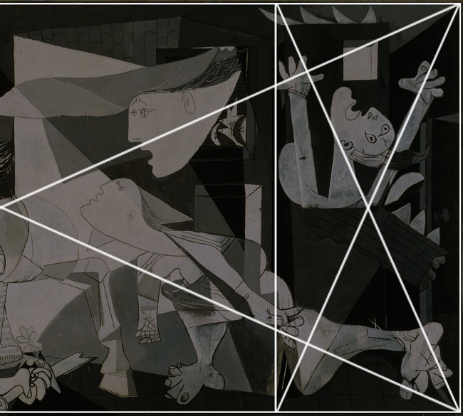 There is a lot of drama going on in this scene with the mother on the left holding a dead child, a dismembered soldier on the ground with symbols of martyrdom etched into his palm, a horse with a gaping wound, the woman screaming in agony on the right, and the light fixture above creating a devilish eye. Picasso put a lot of thought into how he wanted to present this scene, and he didn’t fall short with his composition and use of the golden section.
