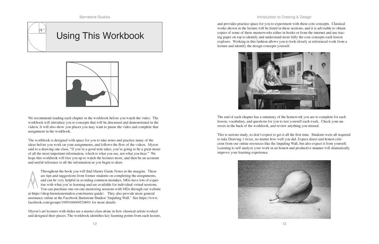 Created by accomplished Barnstone Studios alumni as a companion to Myron's recorded classes, The Barnstone Method of Drawing and Design: Introduction to Drawing & Design Workbook guides the reader through each of the introductory video lessons available through BarnstoneStudios.com. It provides detailed instructions, clear illustrations, and practical tips. Using this workbook in tandem with Barnstone's recorded classes, you will, in his words,